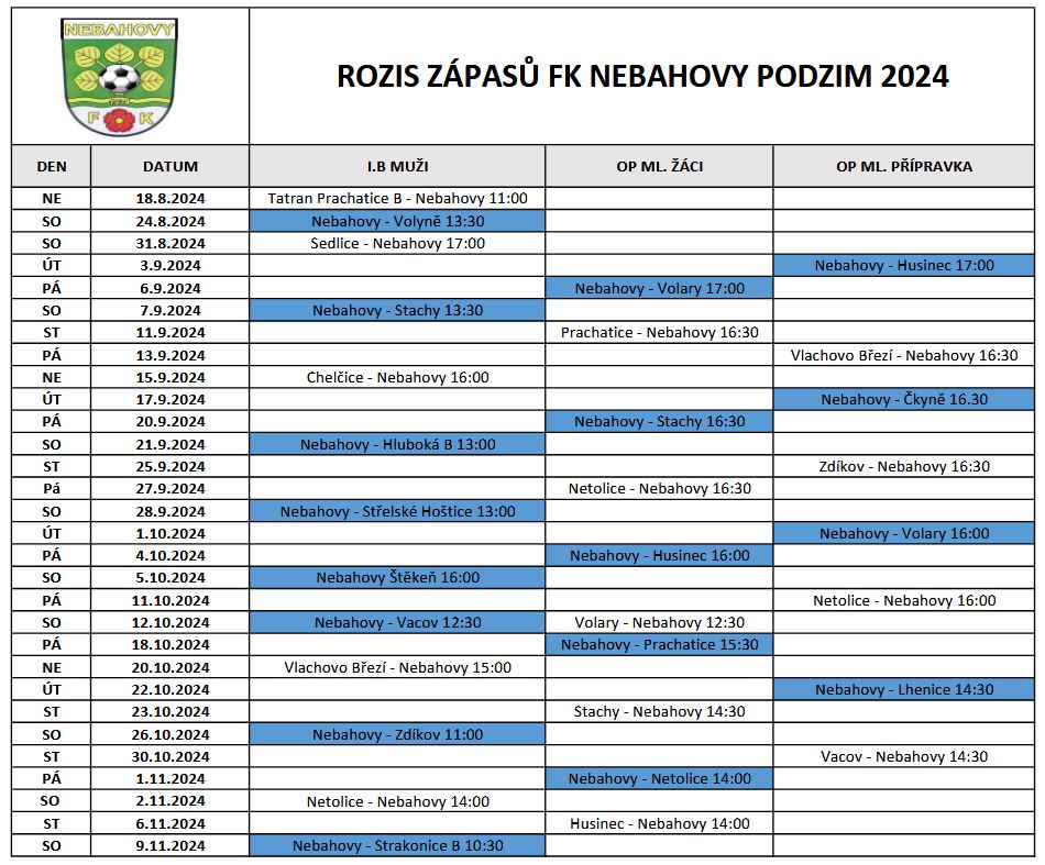 Rozpis zápasů FK Nebahovy podzim 2024