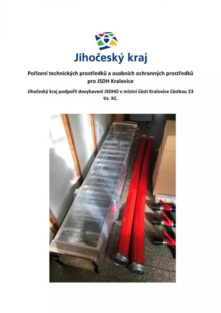 Jihočeský kraj podpořil dovybavení JSDHO v místní části Kralovice částkou 23 tis. Kč.
