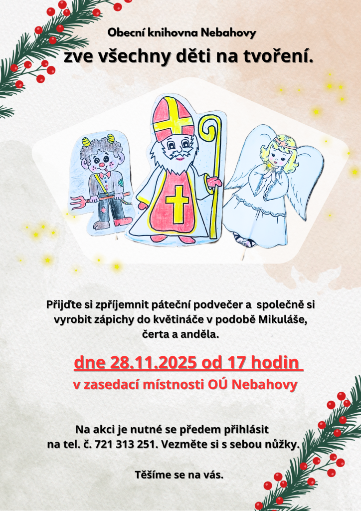 Přijďte si zpříjemnit páteční podvečer a vyrobte si s námi zápichy do květináče. Pořádáme akci, na které si vytvoříte postavy Mikuláše, čerta a anděla. Akce se koná 28. listopadu 2025 od 17 hodin v zasedací místnosti OÚ Nebahovy. Nezapomeňte se předem přihlásit na telefonním čísle 721 313 251 a vzít si s sebou nůžky. Těšíme se na vaši účast.