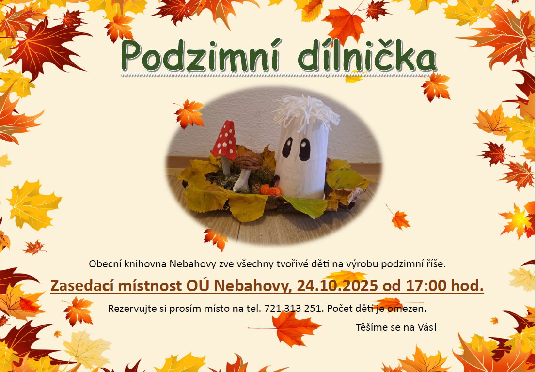 Obecní knihovna Nebahovy pořádá podzimní dílničku, která je určena všem tvořivým děti. Akce se uskuteční 24. října 2025 od 17:00 hodin v zasedací místnosti Obecního úřadu Nebahovy. V rámci dílničky si účastníci vyrobí vlastní podzimní říši. Počet míst je omezen, proto doporučujeme rezervaci na telefonním čísle 721 313 251. Těšíme se na vaši účast a společné tvoření.