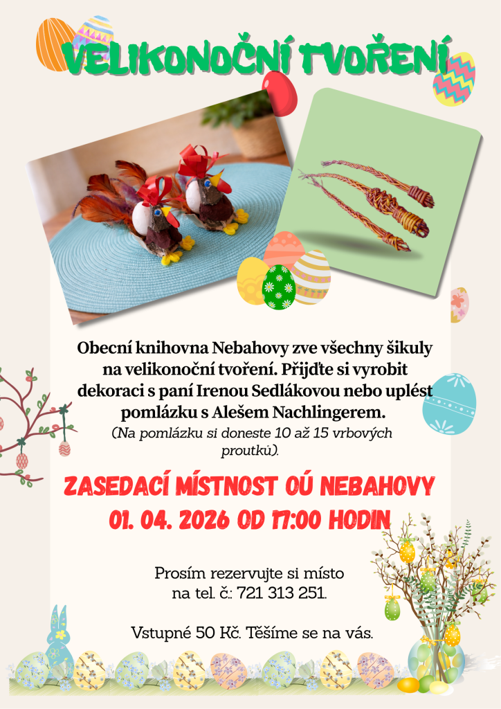 Přijďte si 1. dubna 2026 od 17 hodin do obecní knihovny Nebahovy vytvořit velikonoční dekoraci s paní Irenou Sedlákovou nebo uplést pomlázku s Alešem Nachlingerem.